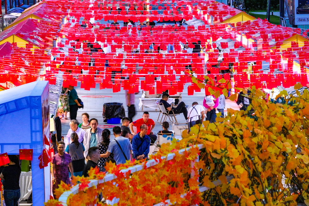 10月2日,雅安市雨城区熊猫绿岛街区的礼包发放点,游客通过扫描专属二维码参与活动,首日已发放1万份‘三免’礼包。展销区50个展位前游客络绎不绝,多种农特产品和美食深受喜爱。