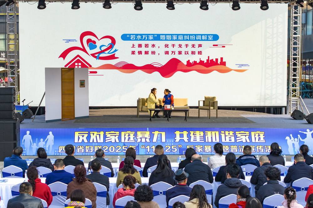 11月25日,四川省妇联在雅安举办以“反对家庭暴力共建和谐家庭”为主题的反家暴主题普法宣传活动,通过情景剧、现场问答、主题宣讲等形式普及家庭暴力的相关法律知识。