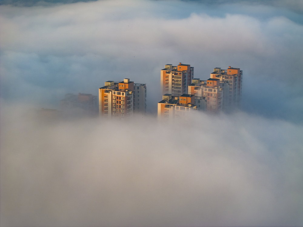 12月17日,雅安市雨城区大兴、草坝等区域再现平流雾景观。置身楼顶望去,一栋栋高层建筑笼罩在“云海”当中,如梦似幻,宛如“天空之城”。