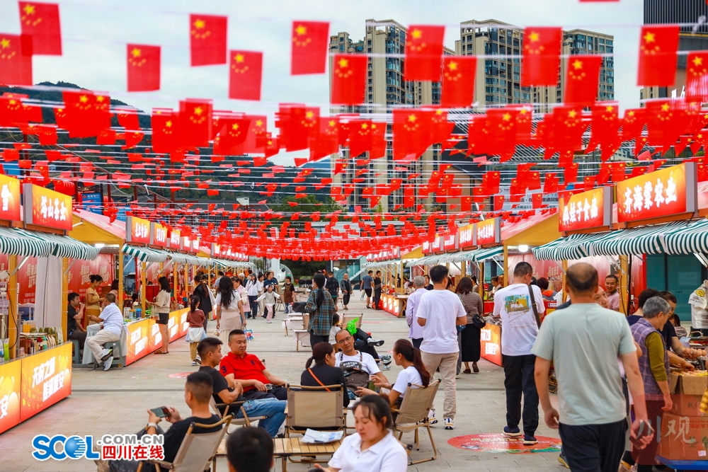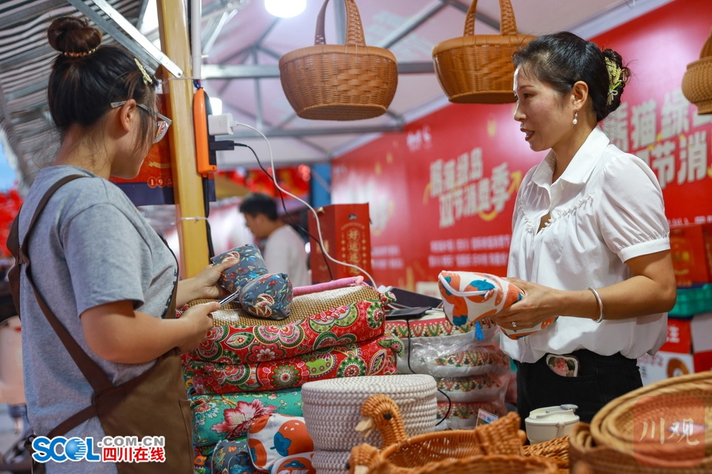 展销区50个展位前熙熙攘攘,腊肉制品、茶叶、花椒等农特产品琳琅满目,猕猴桃、山药等100余款产品新鲜饱满;棒棒鸡、烧烤摊位前排队不断,竹编、石雕等文创产品也备受青睐,充分满足游客“后备箱经济”需求。