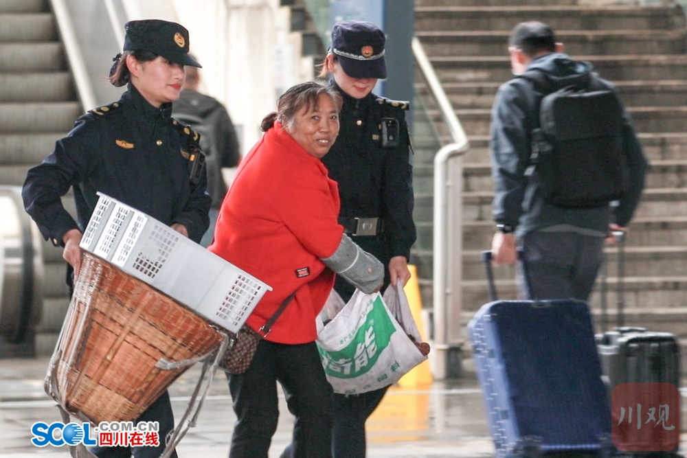 巡查在雅安站附近时,成员发现一位买水果的老奶奶,把摊位摆在了盲道上,周围行人较多。于是,她们上前交流,请老奶奶将摊位挪到规定区域。阴雨天中,考虑到老人行动不便,两位姑娘自然地将水果用一块布包起来,帮老人抬到合适的位置,老人连声感谢。周边的商贩看到这暖心的一幕,热情地邀请姑娘们吃烤洋芋,暖下身子。