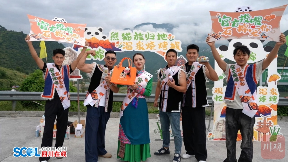 在雅西高速石棉服务区,身着当地特色民族服饰的工作人员佩戴“石棉文旅推荐官”绶带,手持印有“熊猫放归地·温泉烧烤城”等字样的创意“投喂”牌,热情地向过往游客介绍“投喂”石棉特产及文创产品,吸引了大量游客参与。