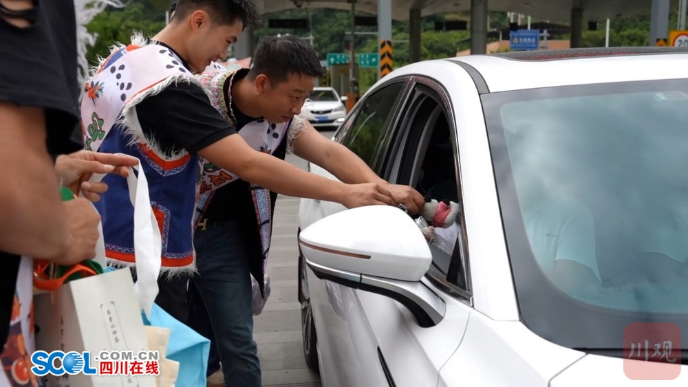 雅西高速石棉出站口“投喂”现场同样热闹。当地工作人员、志愿者以及小朋友组成“投喂小队”,热情地将黄果柑精酿啤酒、文创包、老鹰茶、熊猫挂件等礼品快速递进过往车辆,收到特产的游客纷纷表示感谢并打开手机记录这个美好地时刻。