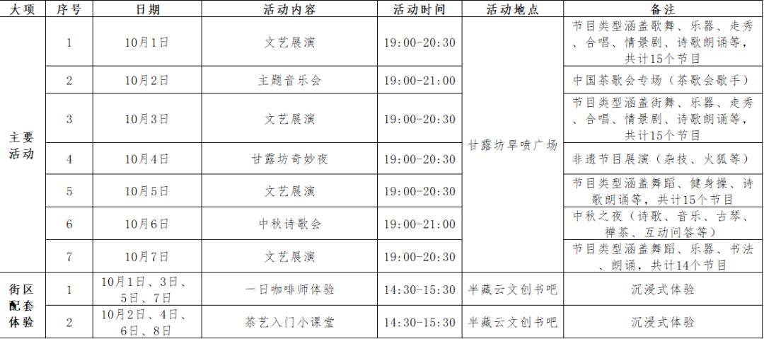 甘露坊特色街区依托茶马古道历史文化,已成为名山新地标。10月1日至8日,这里将举办4场群众性文化展演活动,包含歌曲、舞蹈、琴茶、走秀、朗诵等多种形式。