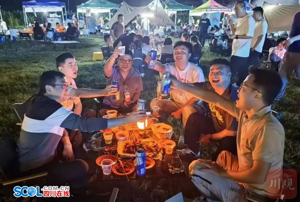 王岗坪乡铭恩广场首次开展为期6天的露营烧烤季活动。游客们围坐一圈享受自助烧烤,现场还有高校乐队驻唱、民族舞蹈演出等精彩节目。