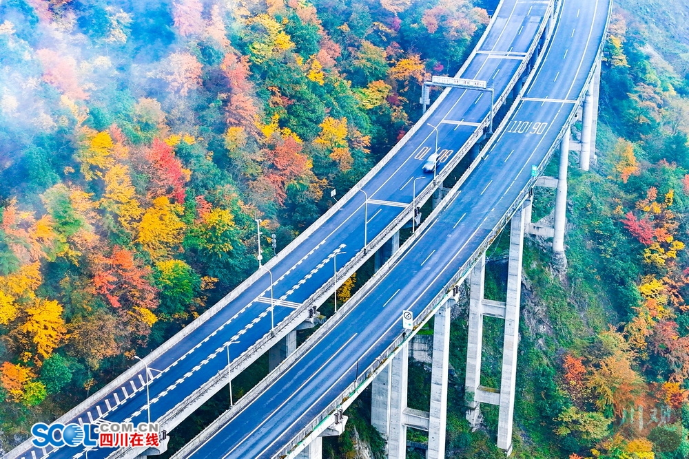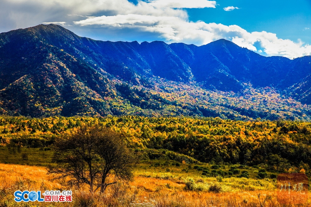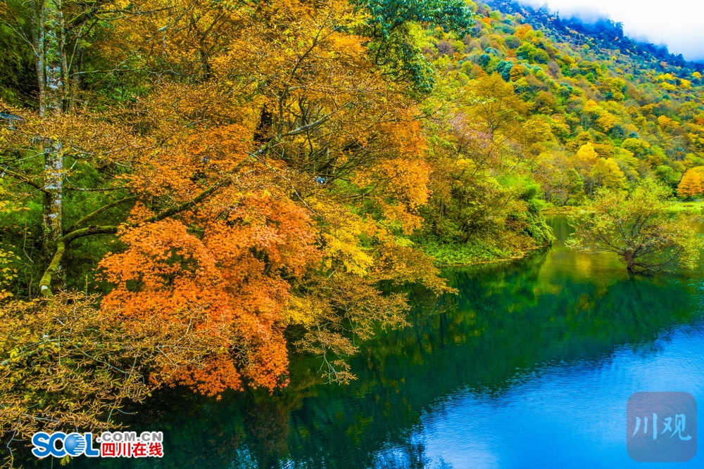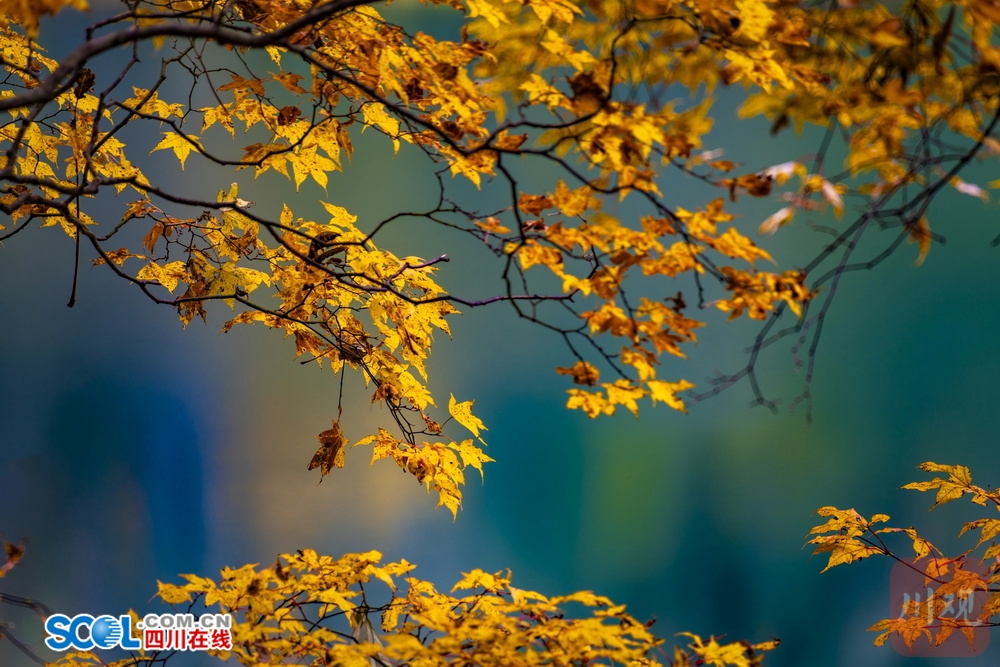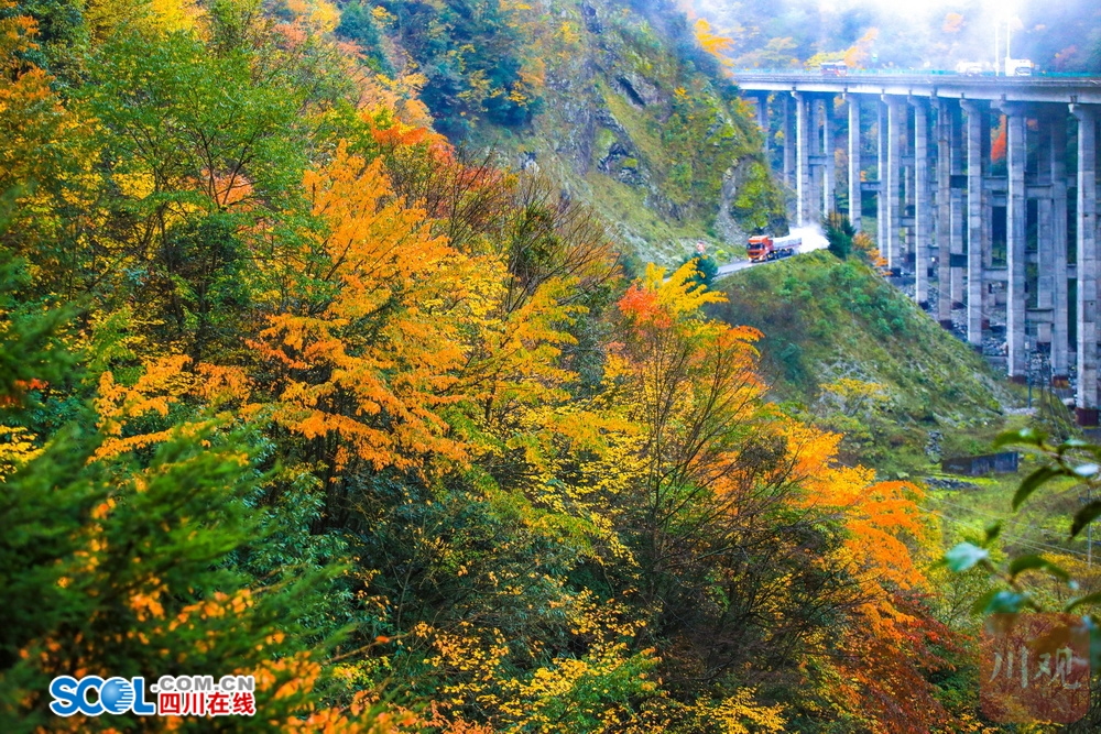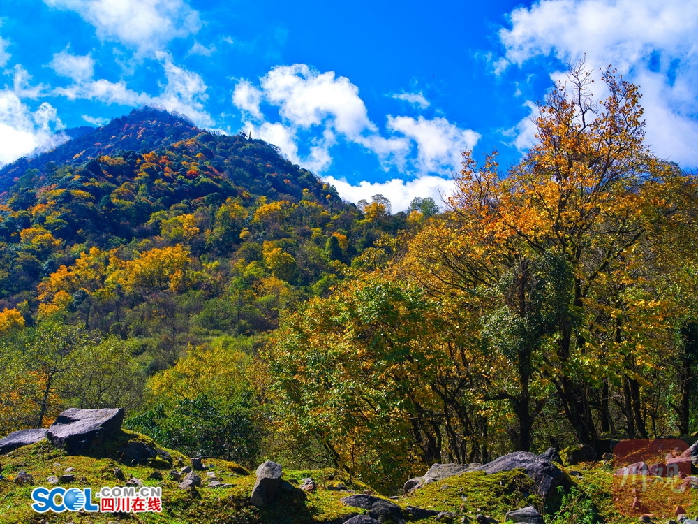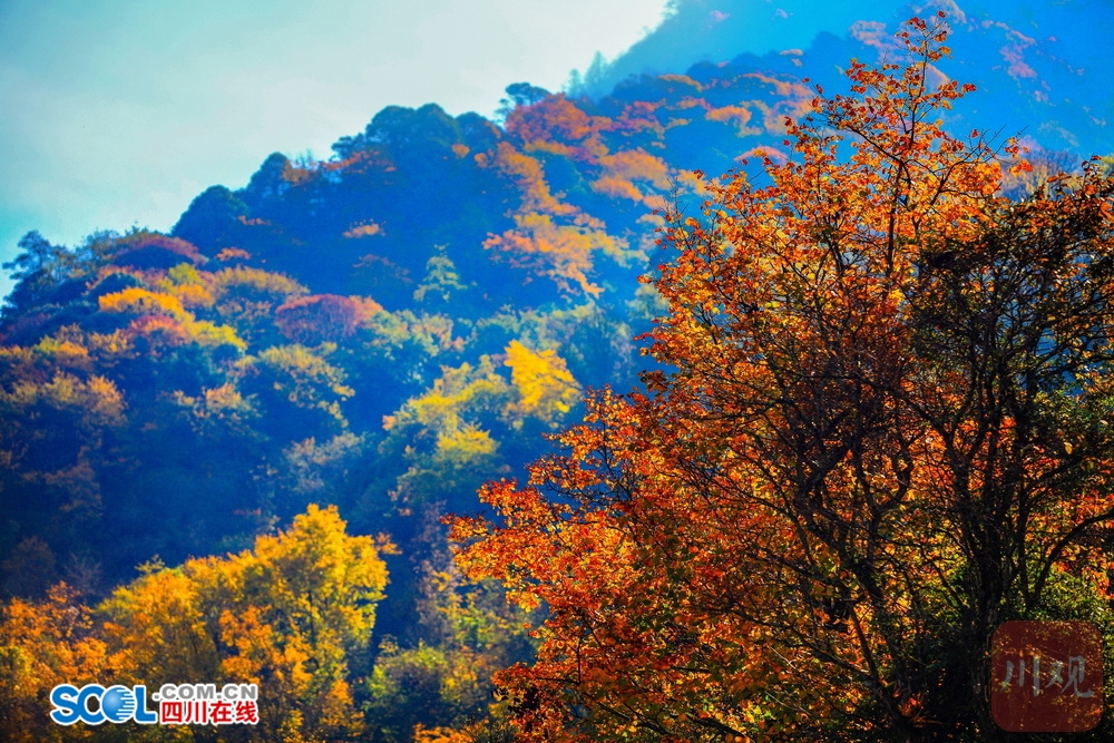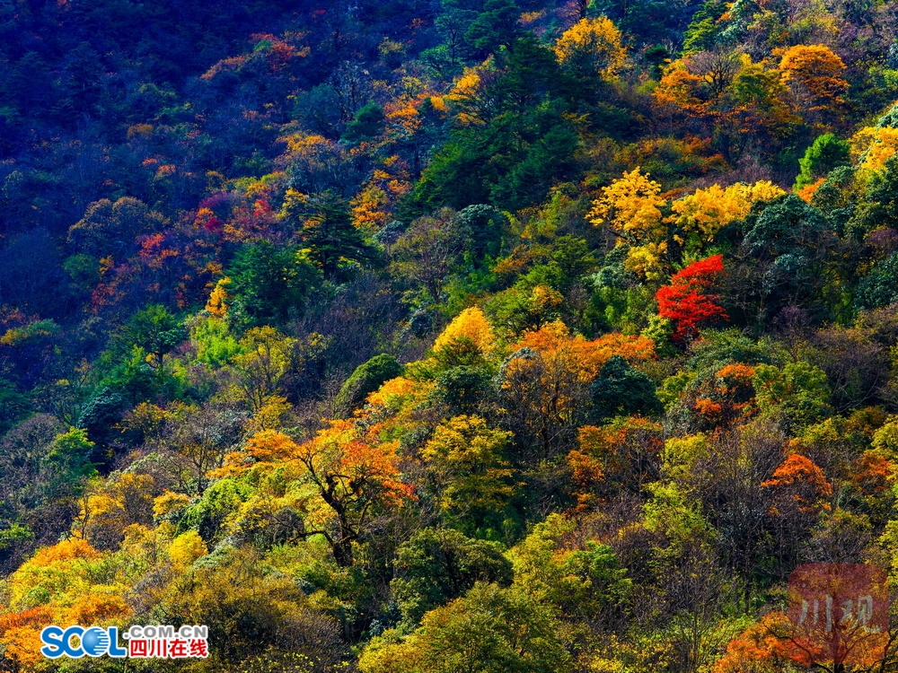 四川在线(雅安频道 黄刚)青山披彩画中游……眼下,雅安市石棉县栗子坪乡孟获城、月亮湖等地的彩林进入盛景期,起伏的群山层林尽染、溢彩流金,与碧水蓝天一起勾勒出一幅宜人的美丽画卷。