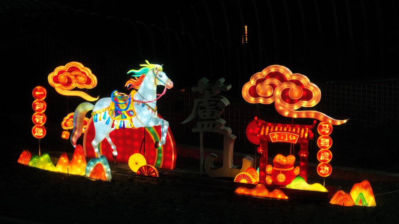 在G351连接口,“一芦有您·马到成功”“姜城焕彩·山水纳福”两组景观率先迎客。金丝楠水街灯笼高悬,夜韵悠长。汉文化广场上,诗词灯廊流光溢彩,葫芦中国结、财神互动装置吸引市民打卡互动。汉姜古城内,墙面灯笼、姜维立马与福马灯光相映成趣,古城气韵扑面。文庙街区则立足“学子圣地”定位,设灯笼廊、状元灯、锦鲤灯光连廊等互动场景,随手一拍就是芦山味。