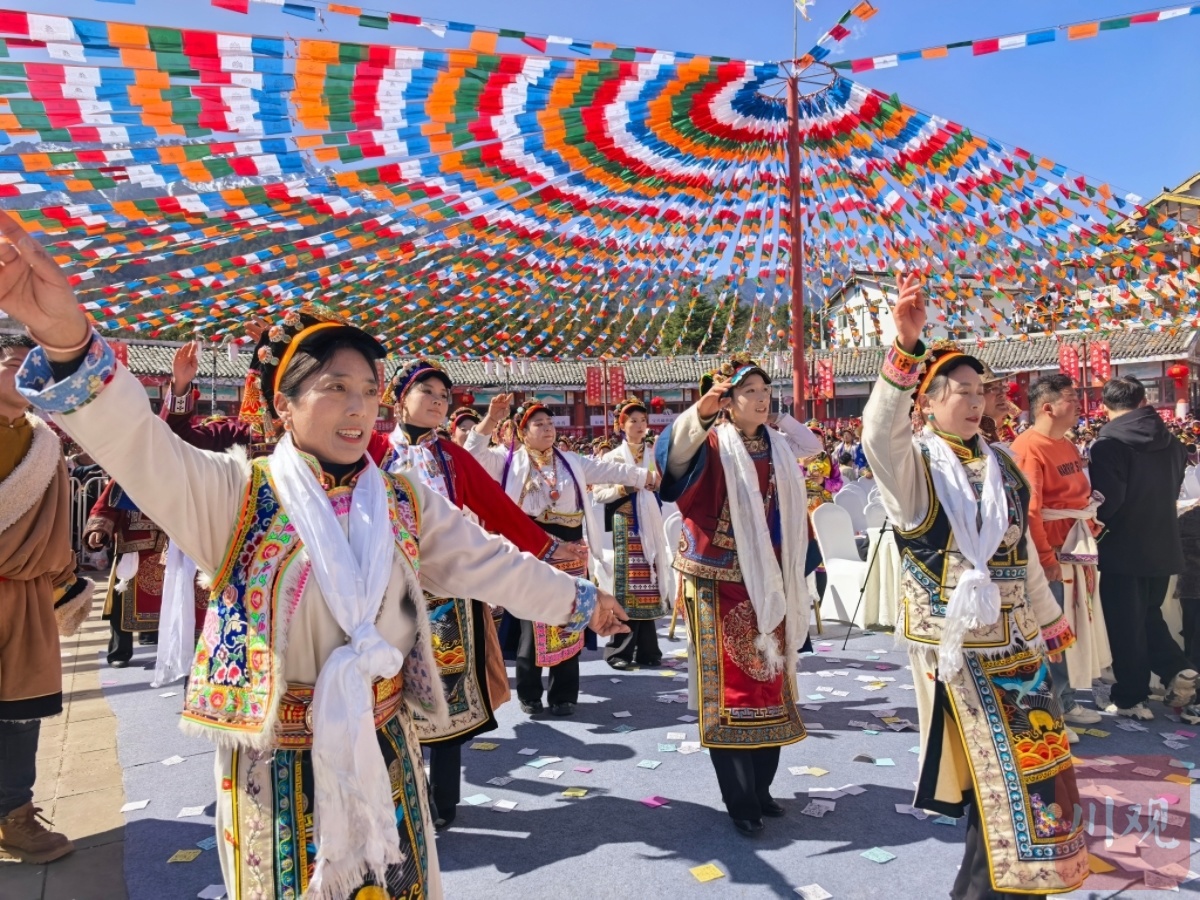 这一天是农历正月初九,一大早,乡亲们和游客们便聚拢在神石园广场,欢庆一年一度的“上九节”。据了解,上九节是当地群众祈福新年、感恩自然的重要节日,已被列入四川省非物质文化遗产目录。在硗碛,它的分量等同于除夕——男女老幼都会穿上量身定做的民族服饰,佩戴特色首饰,盛装相聚,热热闹闹过“新年”。