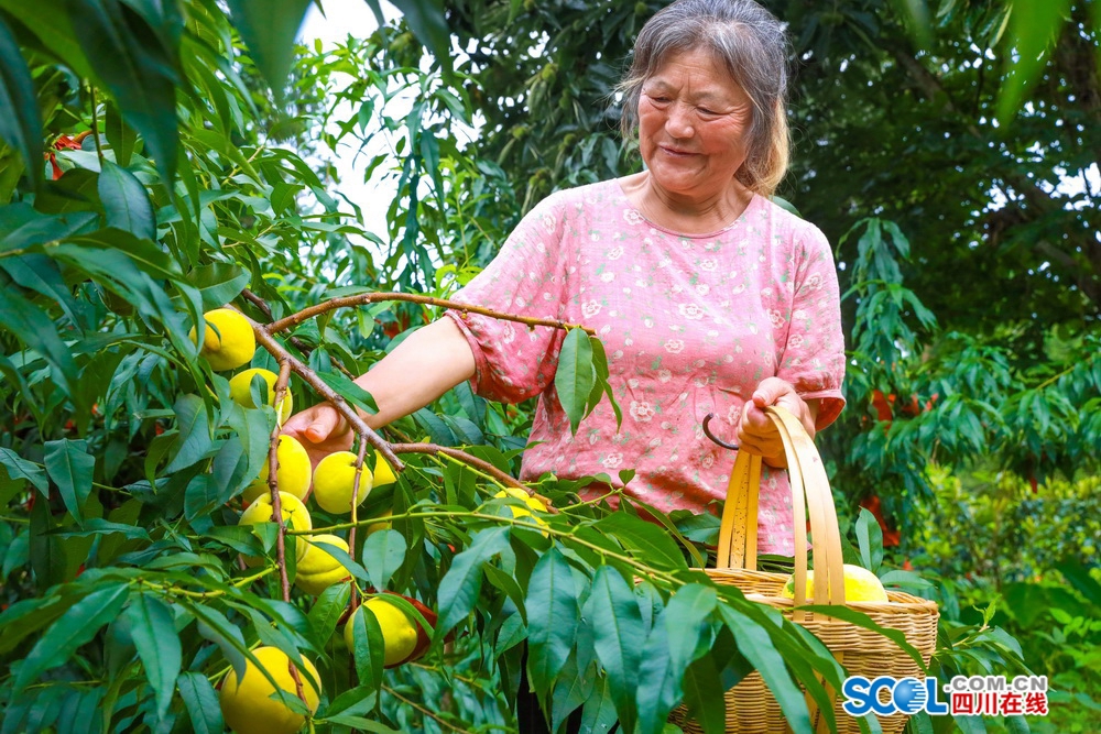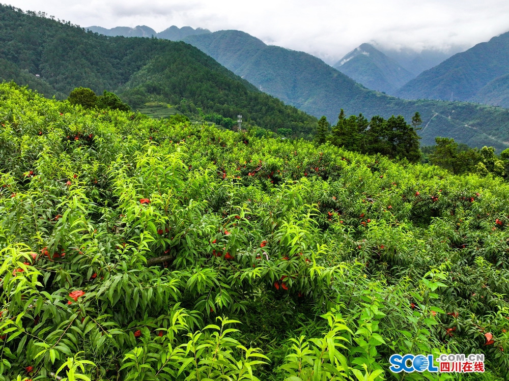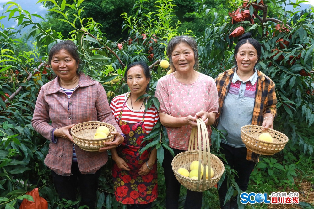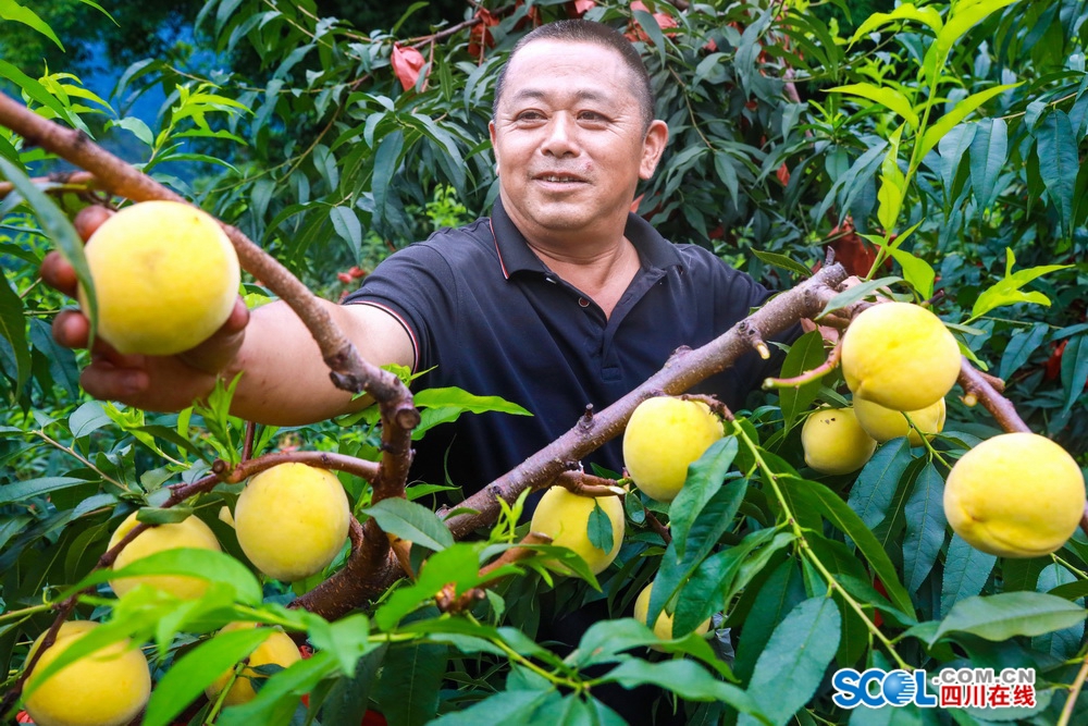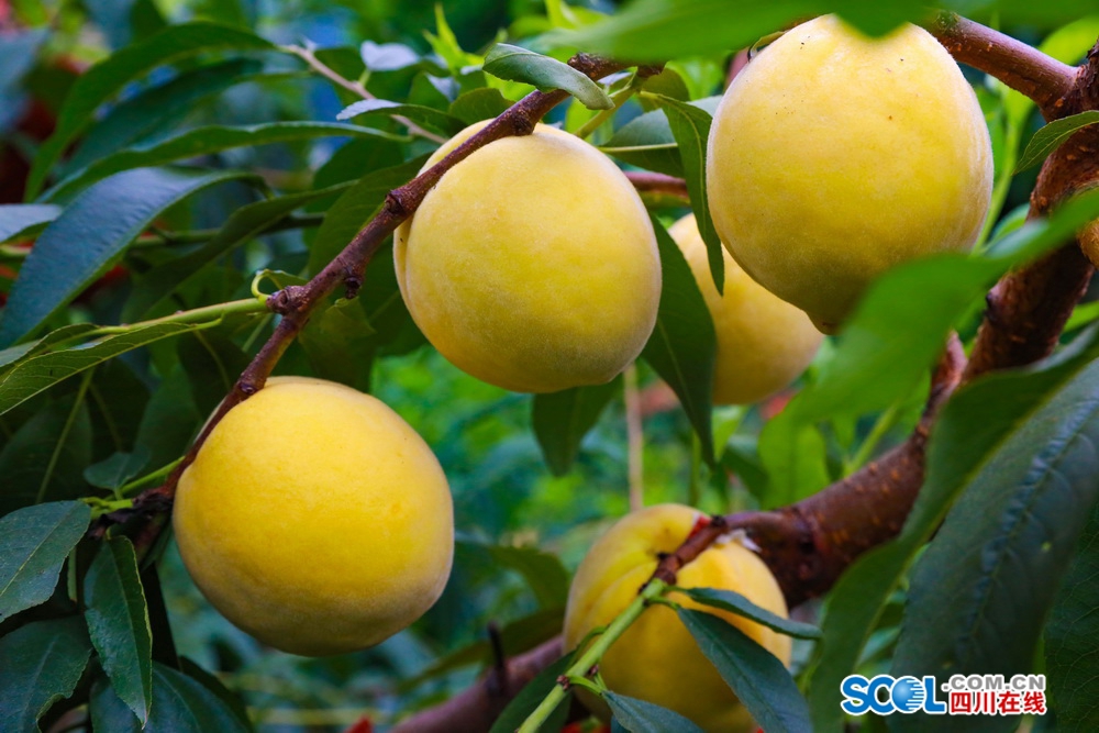 四川在线(雅安频道 黄刚)7月27日,走进雅安市石棉县安顺场镇共和村,成片的桃林跃入眼帘,硕大的黄桃身披“防护衣”挂满枝头,浓郁的果香四处飘散。