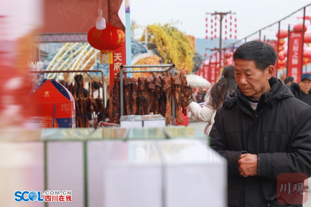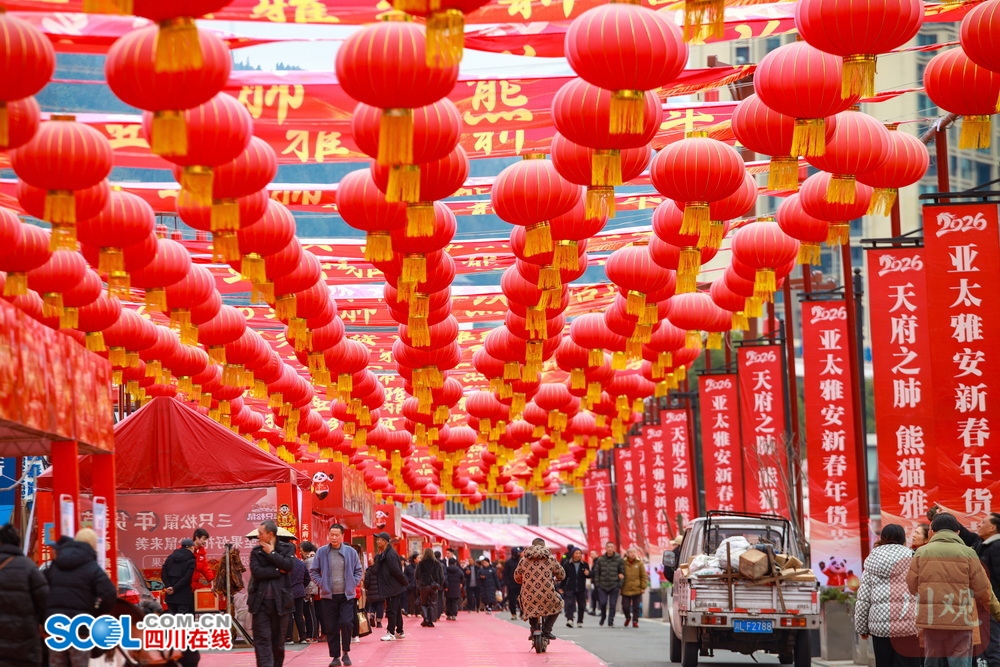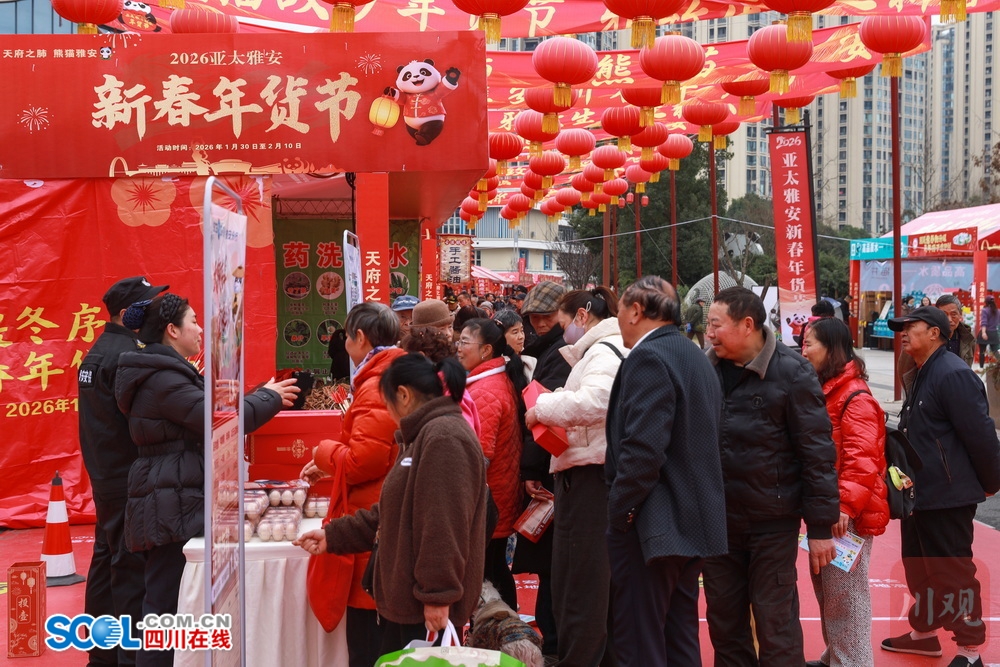 四川在线(雅安频道 黄刚)1月31日,雅安市雨城区熊猫绿岛文旅特色消费街区内,于日前开启的2026亚太雅安新春年货节现场张灯结彩、喜庆洋洋,充满了办年货赶大集的氛围感。
