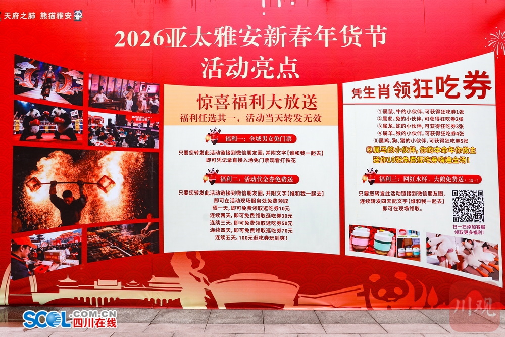 据了解,本次年货节为期12天。期间,将设定不同主题,内容涵盖非遗技艺展演(打铁花、火壶等)、美食文化体验、熊猫主题互动、茶文化品鉴、潮流音乐演出、全民趣味赛事等多个板块。并将举办非遗技艺现场展示、特色美食品鉴、大马戏等系列互动活动,同步推出消费券发放、商家促销等惠民措施。