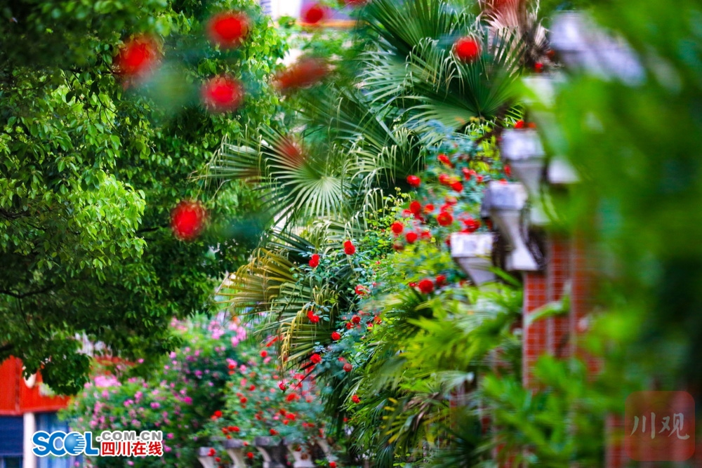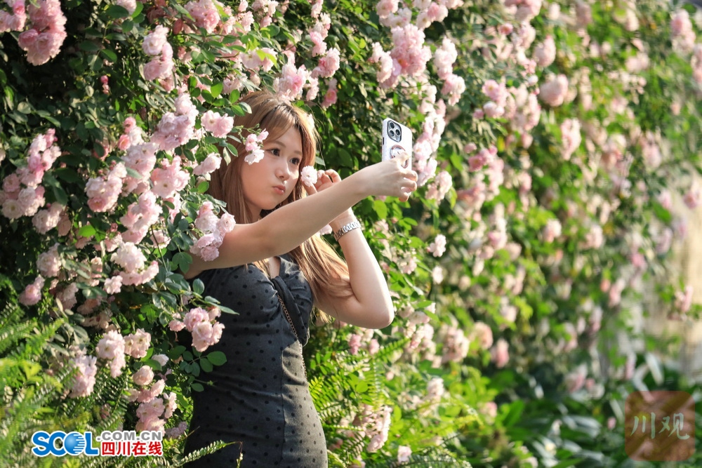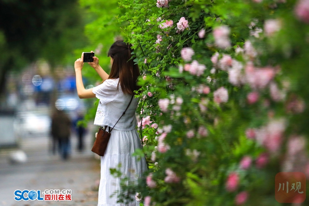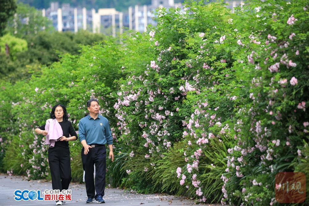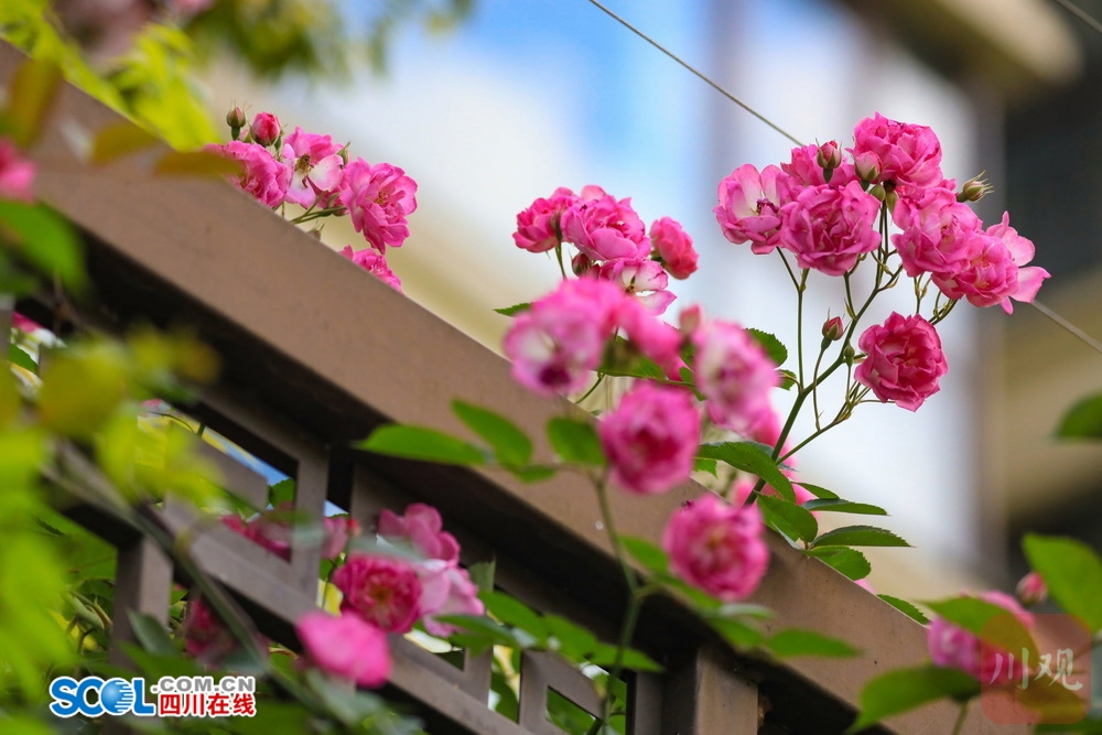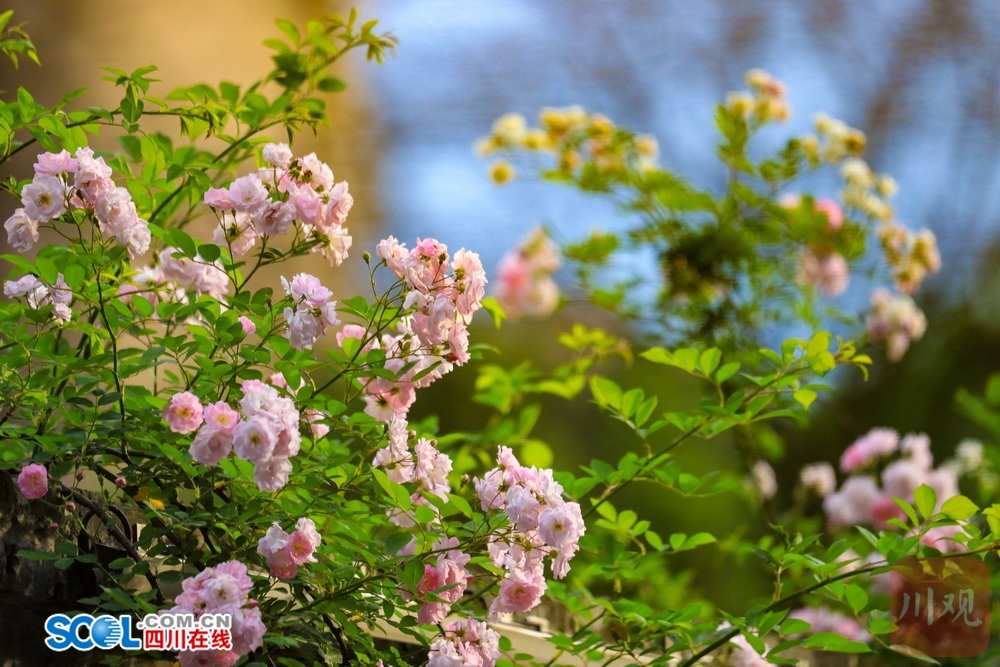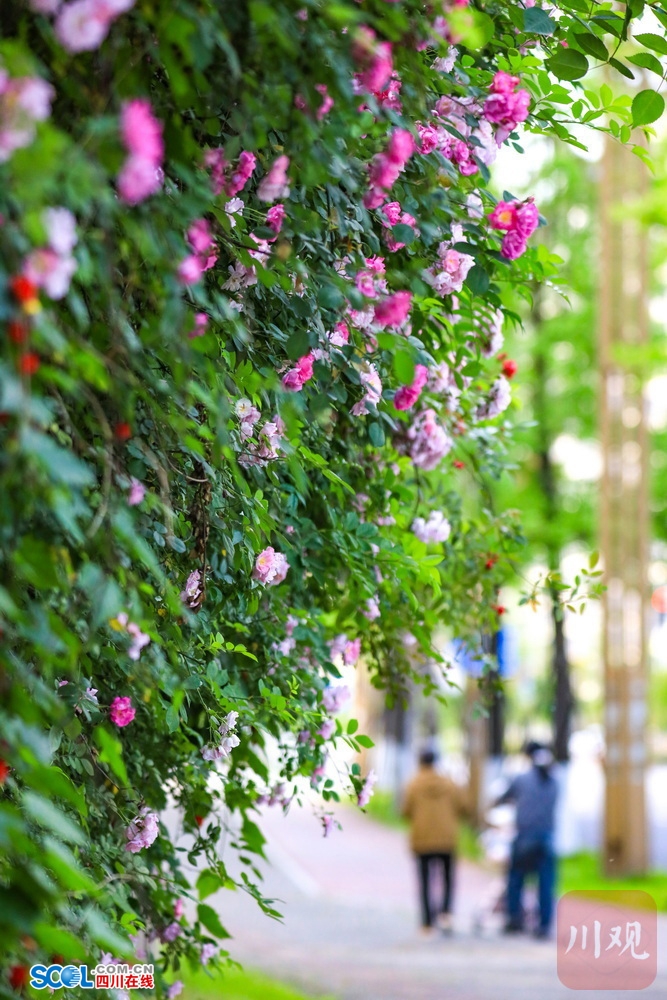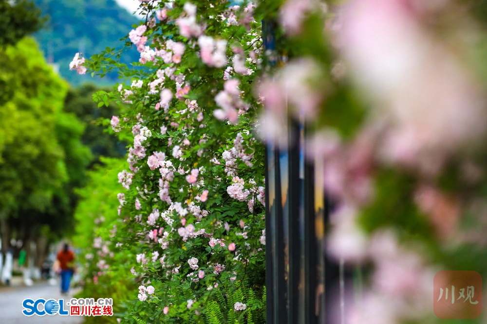 四川在线(雅安频道 黄刚)暮春四月,雅安悄然踏入绚烂的“蔷薇季”。4月15日,漫步于雅安市雨城区大街小巷,围栏与院墙上,一簇簇、一丛丛蔷薇、月季等热烈盛放,大红、粉红、雪白等各色花朵簇拥成团,宛如云霞倾泻而下,又似灵动的花墙“瀑布”,将城市妆点得诗意盎然,让市民在暮春时节与满墙繁花撞个满怀。