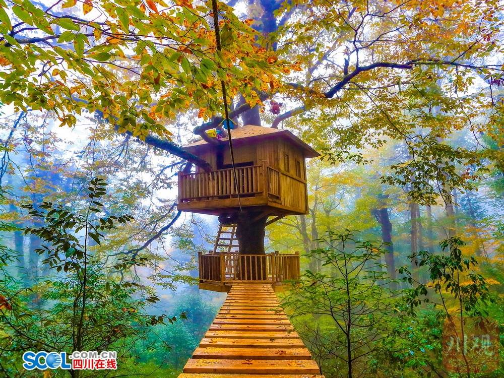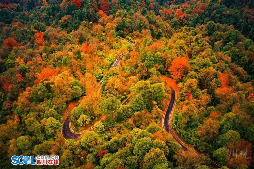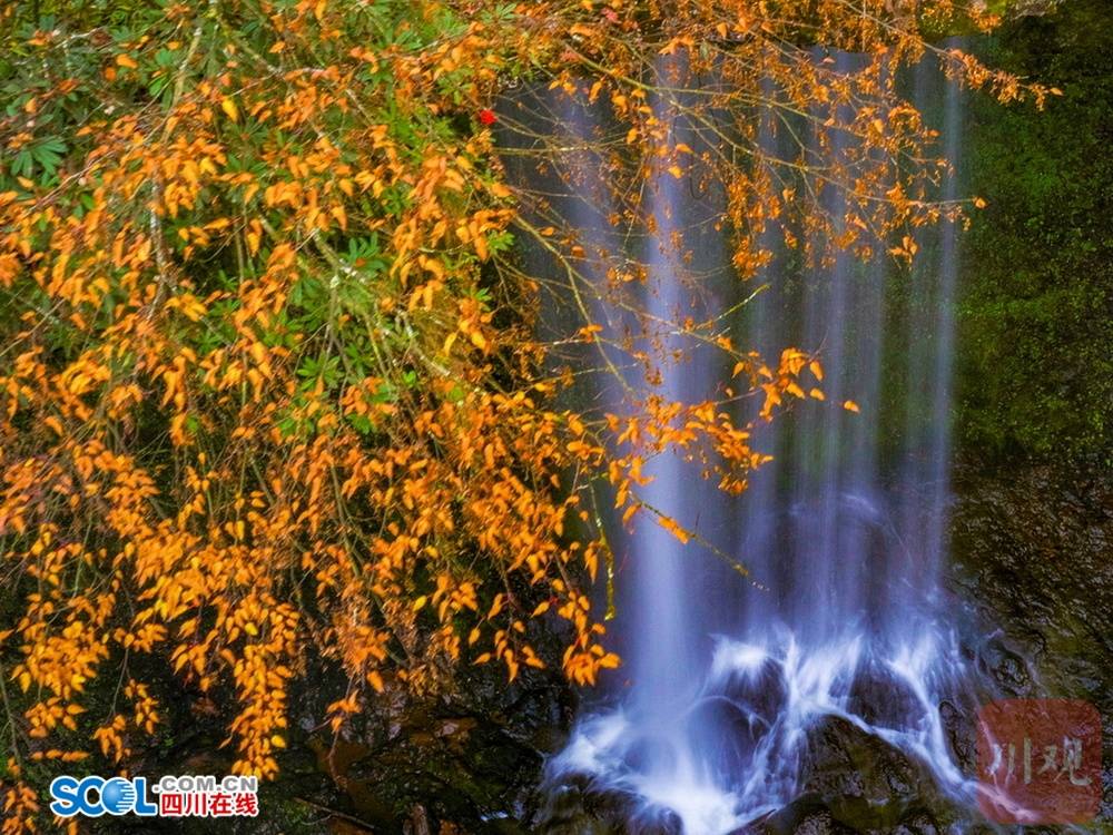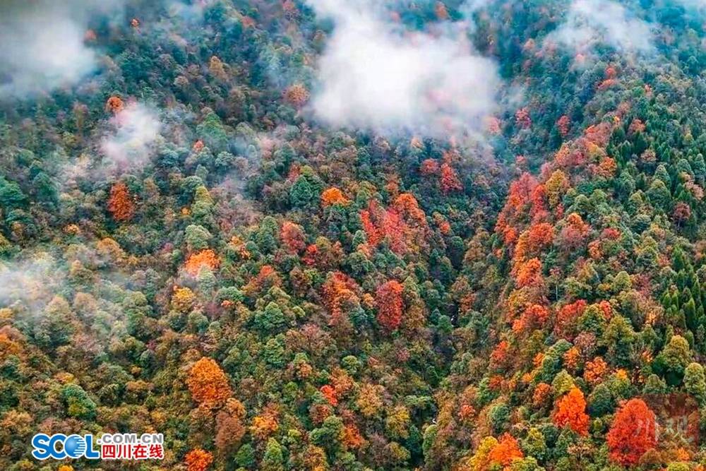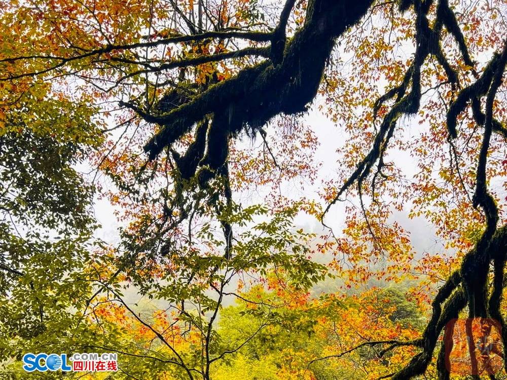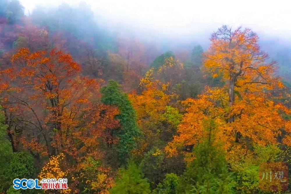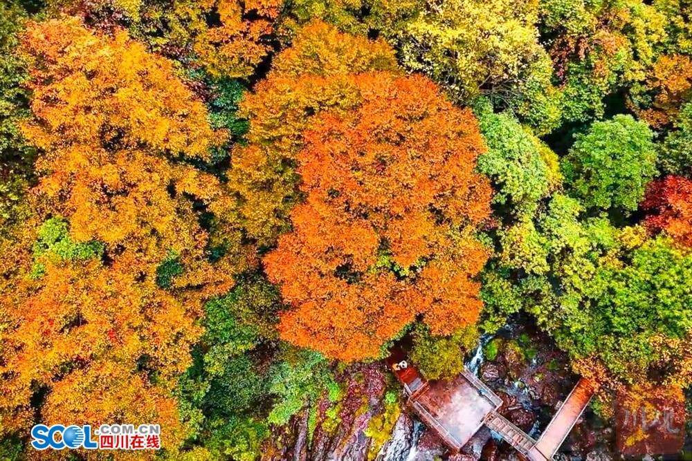 四川在线(雅安频道 黄刚 记者 李婷)红叶似火、黄叶如金……这段时间,雅安市荥经县龙苍沟国家森林公园内,绯红、橙黄、金褐的彩叶层层叠叠,披上了多彩外衣的山林仿佛正上演一场浓墨重彩的“时装秀”,将深秋初冬的氛围感拉满。