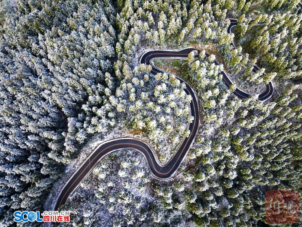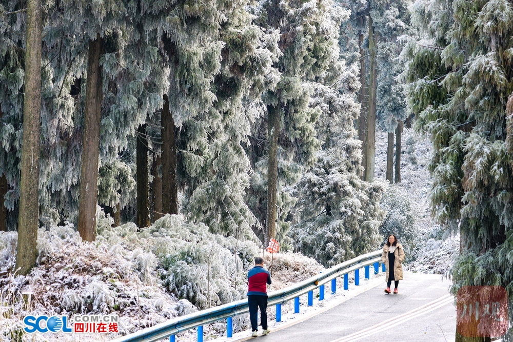 四川在线(雅安频道 黄刚)经历元旦假期末尾的一波降温,1月4日,位于雅安市雨城区东南的周公山一夜“白了头”。2016年的首场降雪,令茂密的森林公园披上淡淡的银装,晶莹剔透的银枝在寒风中微微摇动,白与绿的交织,构成了一幅别样的水墨画卷。