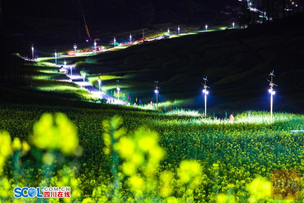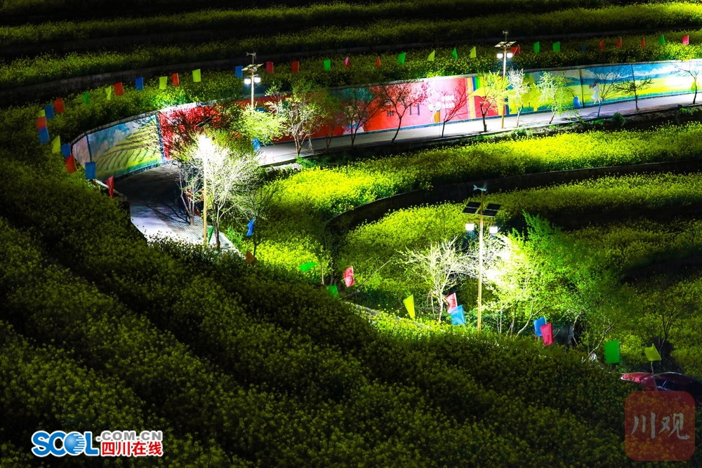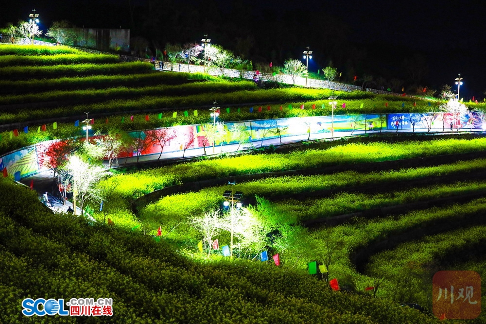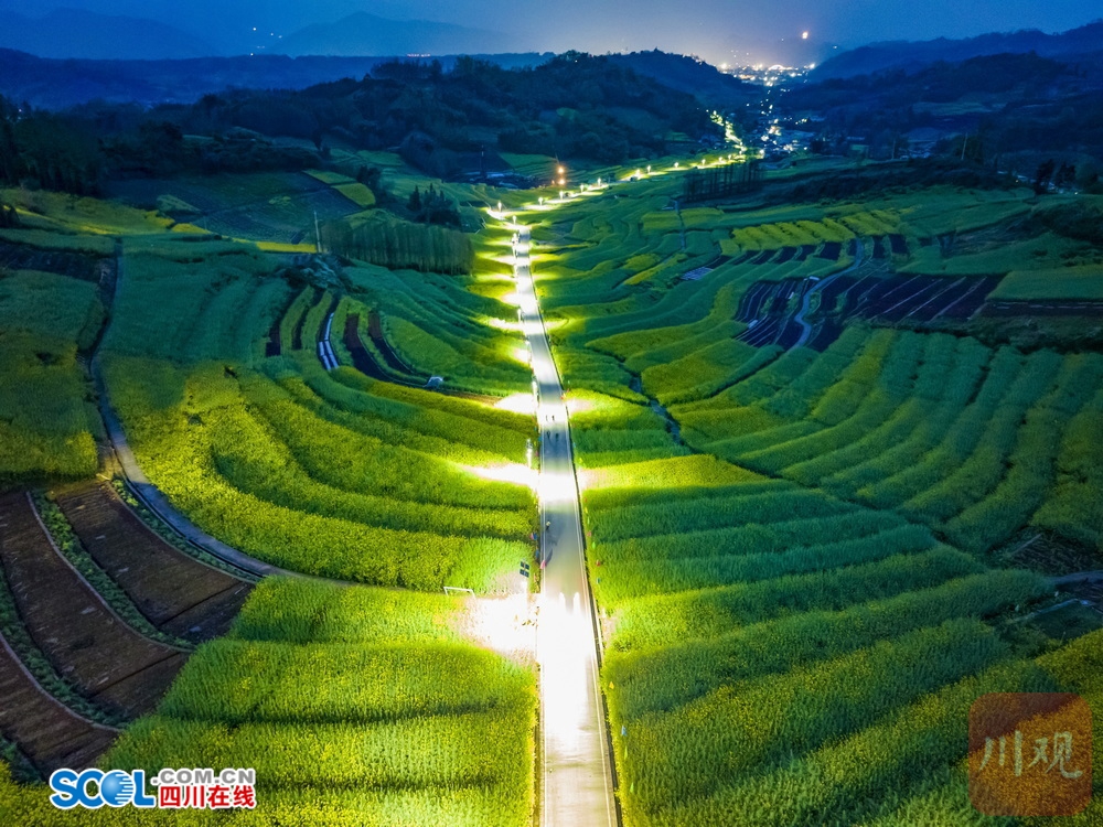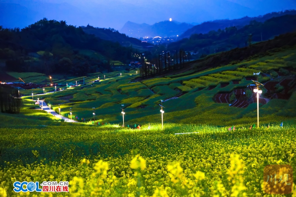 四川在线(雅安频道 黄刚)3月21日,雅安市芦山县芦阳街道的大同万亩粮经复合园内,随着暮色的降临,田间步游道两侧的太阳能路灯陆续亮起,暖光灯带点亮片片油菜花田,令层层梯田在夜色中泛出温柔绿光,与远处的灯火与山间夜色相融,静谧又梦幻,仿佛闯入私藏的灯海秘境。夜空下的浪漫花海,成为不少市民和游客“夜”里看花的打卡地。