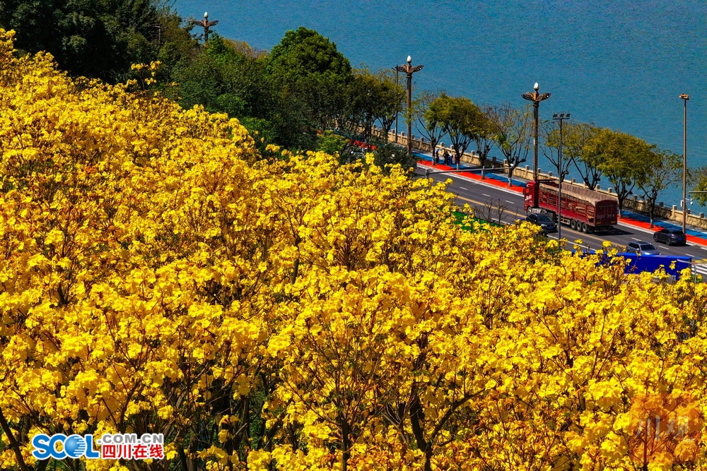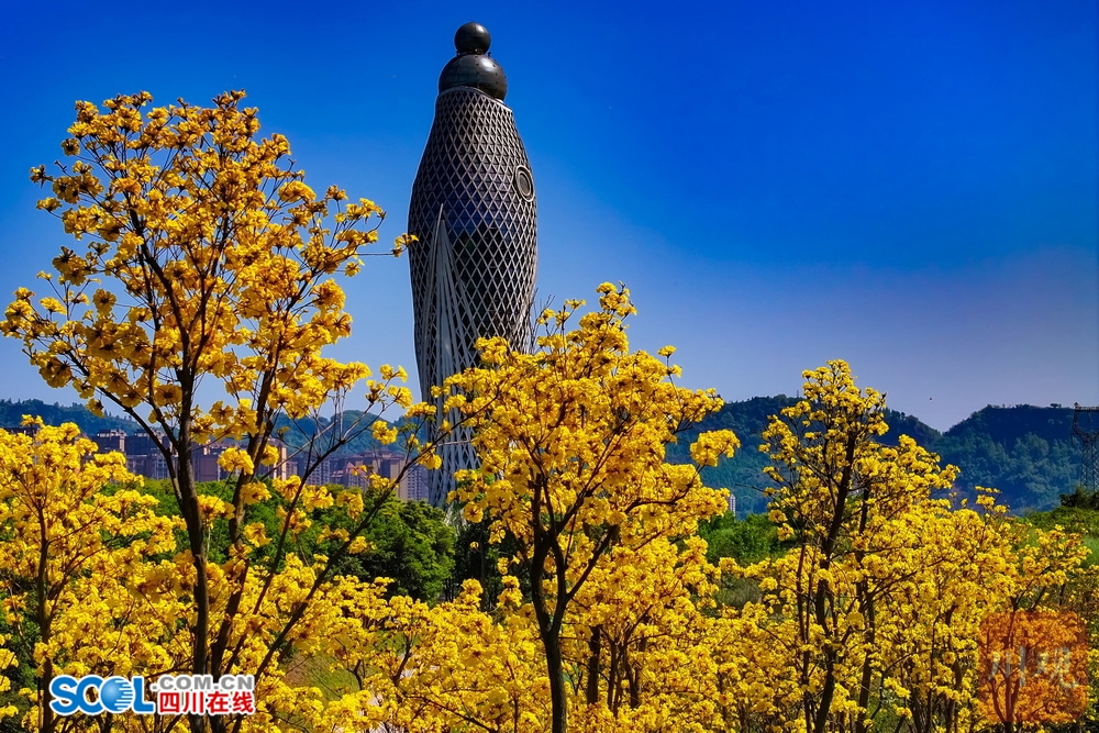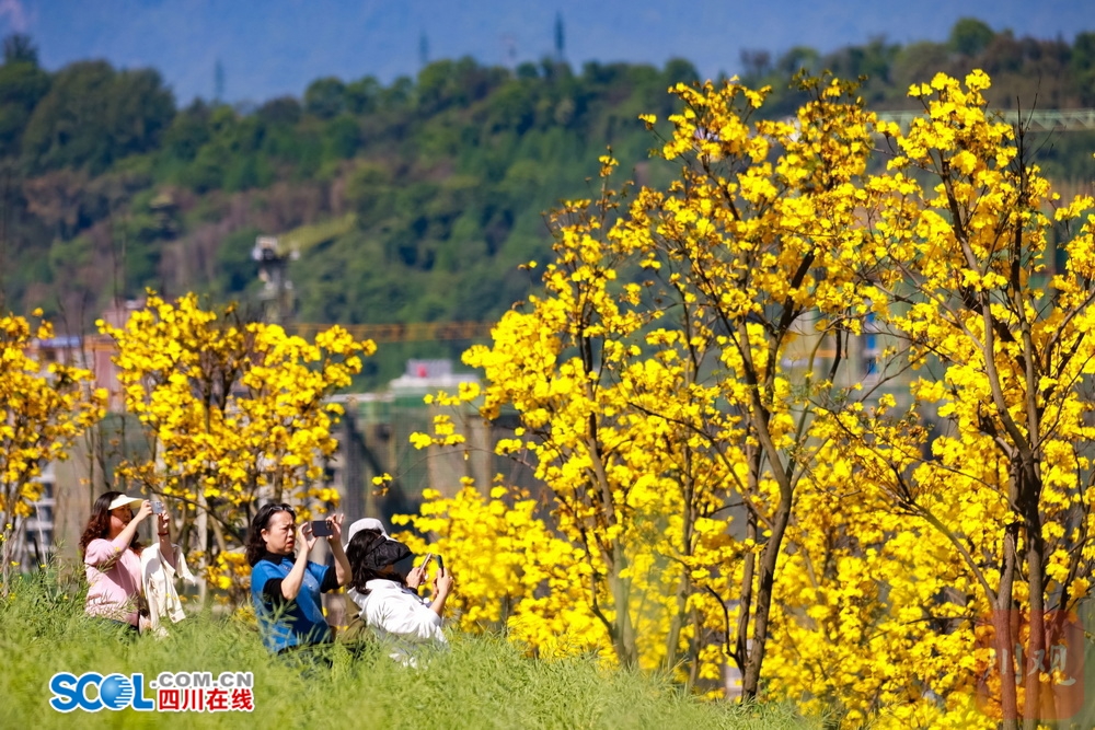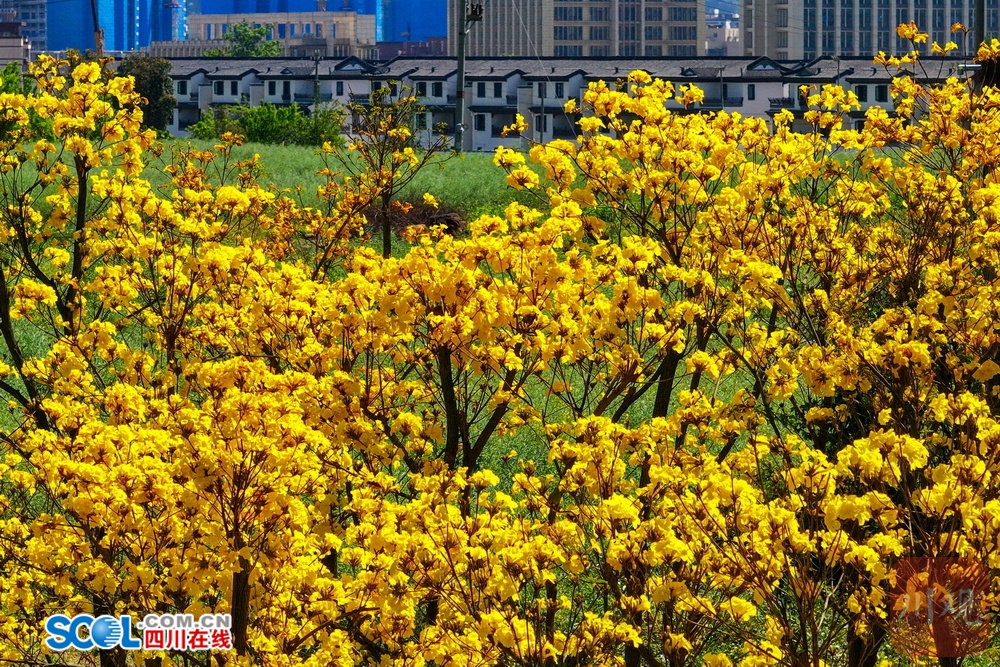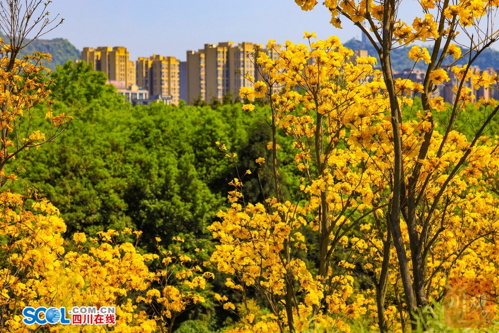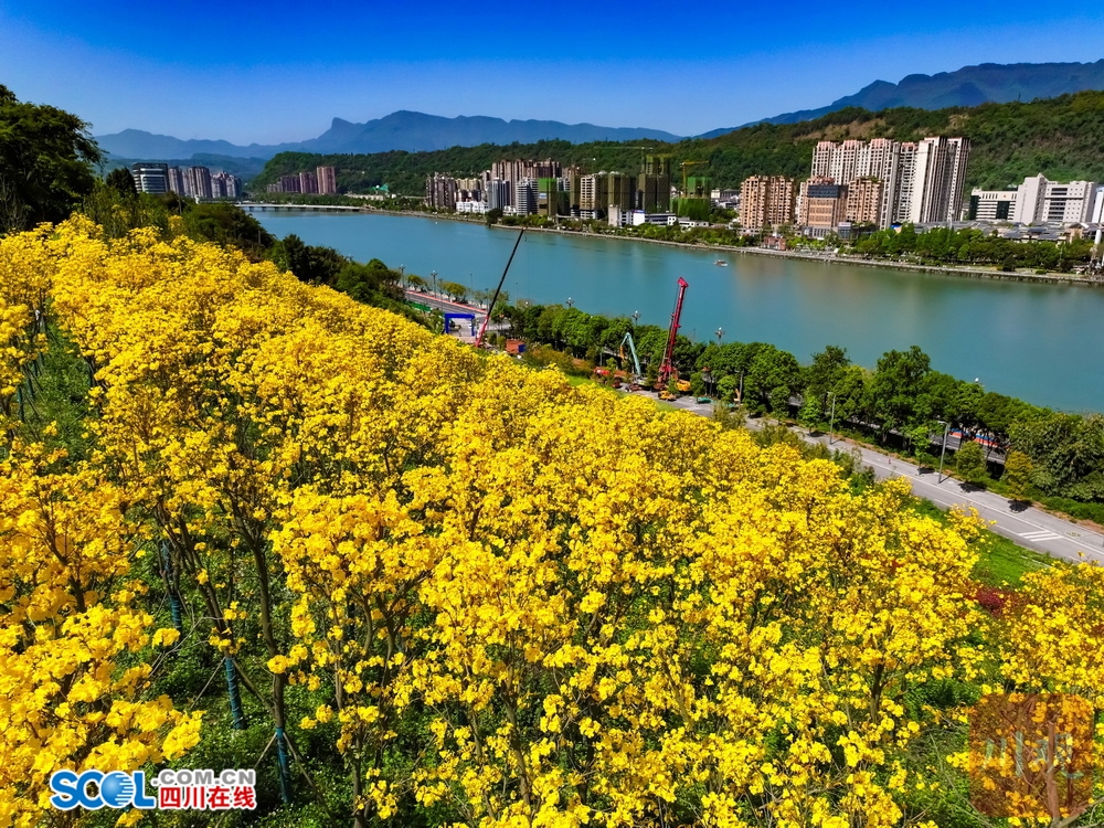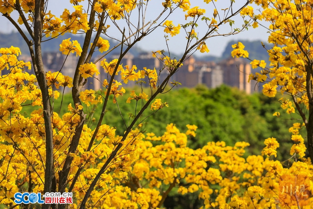 四川在线(雅安频道 黄刚)春风送暖,万物复苏,正是踏青赏春的好时节。4月9日,雅安市雨城区南外环线旁的梅家岗(小地名),连片的黄花风铃木绚烂绽放,金黄色的花朵如风铃般缀满枝头,满目烂漫,与一旁的青衣江和城市楼宇相融,将春日的氛围感拉满。