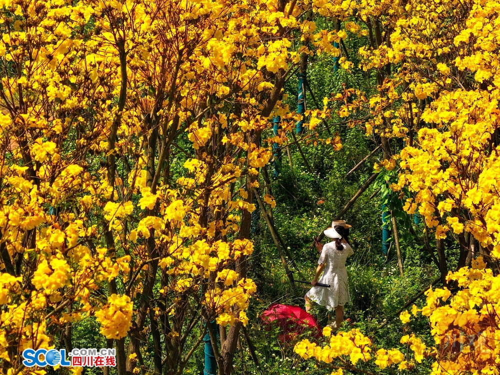 据了解,黄花风铃木原产南美洲,花期约10至15天,目前正值最佳观赏期。凭借纯粹的金黄花色与优美的树形,这片“金色风铃”已成为当地新晋的网红打卡地。