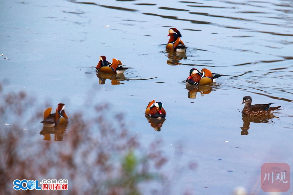 同框的“团员”们也个个有戏:骨顶鸡憨萌游弋,小白鹭静立如画,灰头麦鸡则是一副悠闲做派。更有浪漫彩蛋藏于不远处的慈朗湖——成对的鸳鸯相依相偎,在线派发甜蜜“狗粮”。