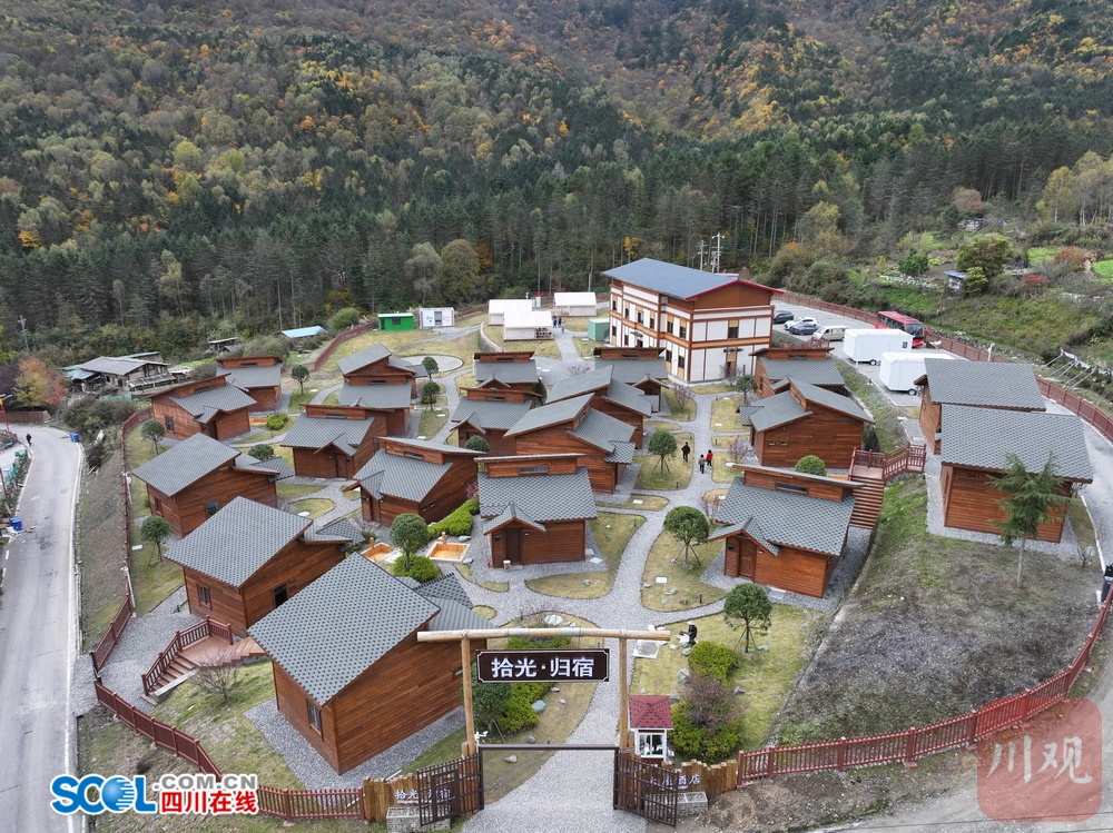 11月6日上午,来到宝兴县硗碛乡,探访新近落成的“拾光·归宿”民宿,原木色独栋木屋错落有致地散布在绿茵之间,与远处的雪山彩林相映成趣,构成一幅动人的山居画卷。