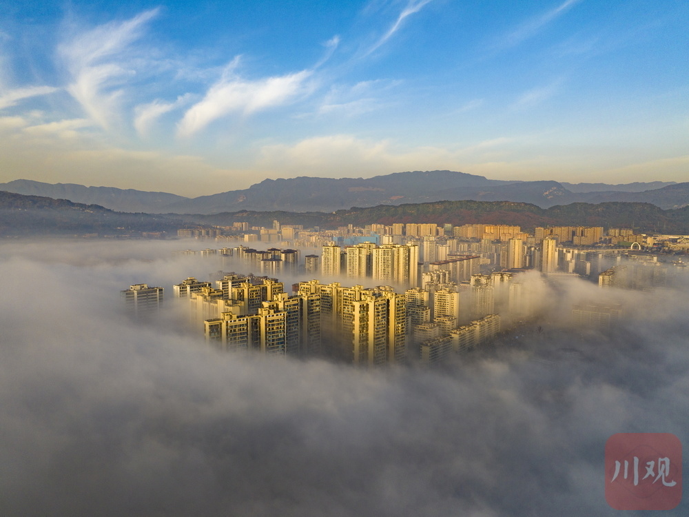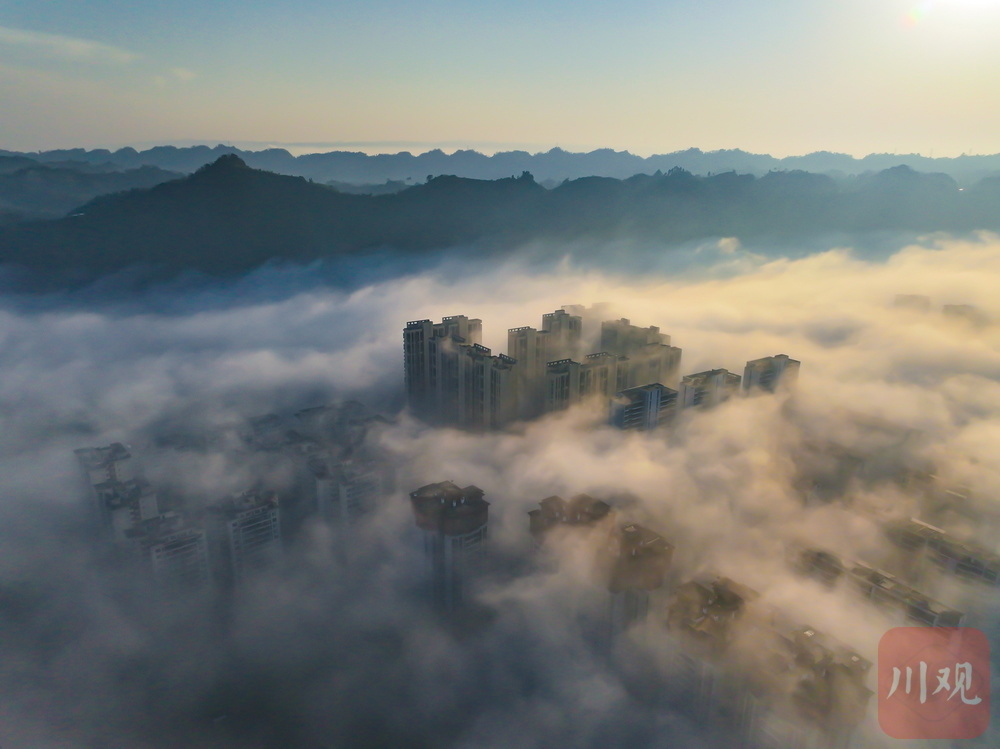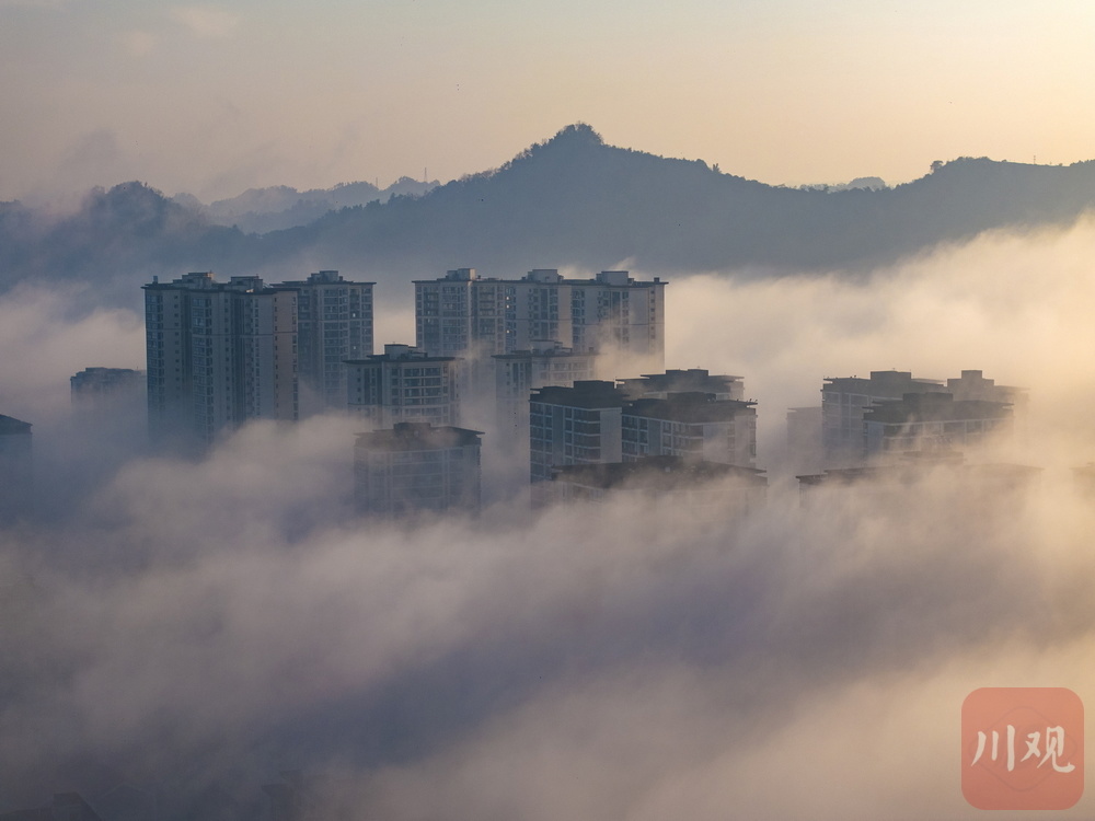 四川在线(雅安频道 黄刚)12月17日,雅安市雨城区大兴、草坝等区域再现平流雾景观。置身楼顶望去,一栋栋高层建筑笼罩在“云海”当中,如梦似幻,宛如“天空之城”。