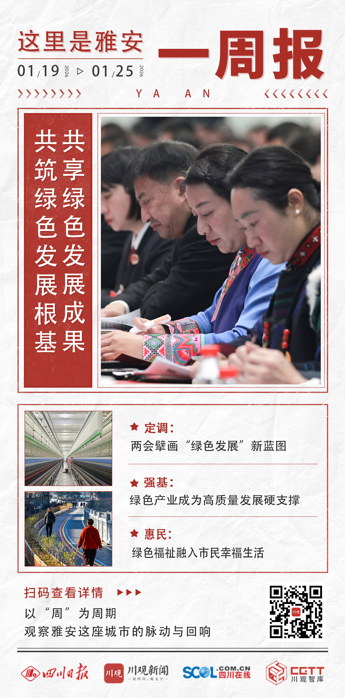 四川在线(记者 李婷 雅安频道 黄刚)2026年第四周(1月19日至1月25日),这一周,雅安市两会召开,不仅系统总结了过去一年的发展成就,更为“十五五”开局之年乃至未来五年锚定了方向——坚定不移走生态立市、产业兴市、开放活市”发展战略,加快建设全省绿色发展先行市、成渝向西开放新高地。
