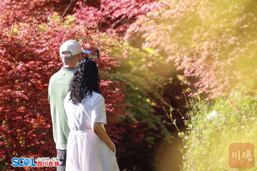 四川在线(雅安频道 黄刚)霜叶赤红确是真,春枫似火实撩人。4月11日,雅安市雨城区周公山镇金船山下,金船山·十里红枫内不同品种的枫叶争奇斗艳,或红似霞、或碧如玉,相互交融、斑斓炫目,成为芳菲四月一道靓丽的“枫”景线,引市民游客纷至沓来,或驻足观赏,或举起手机,定格下一个个美好的春日“枫”景。