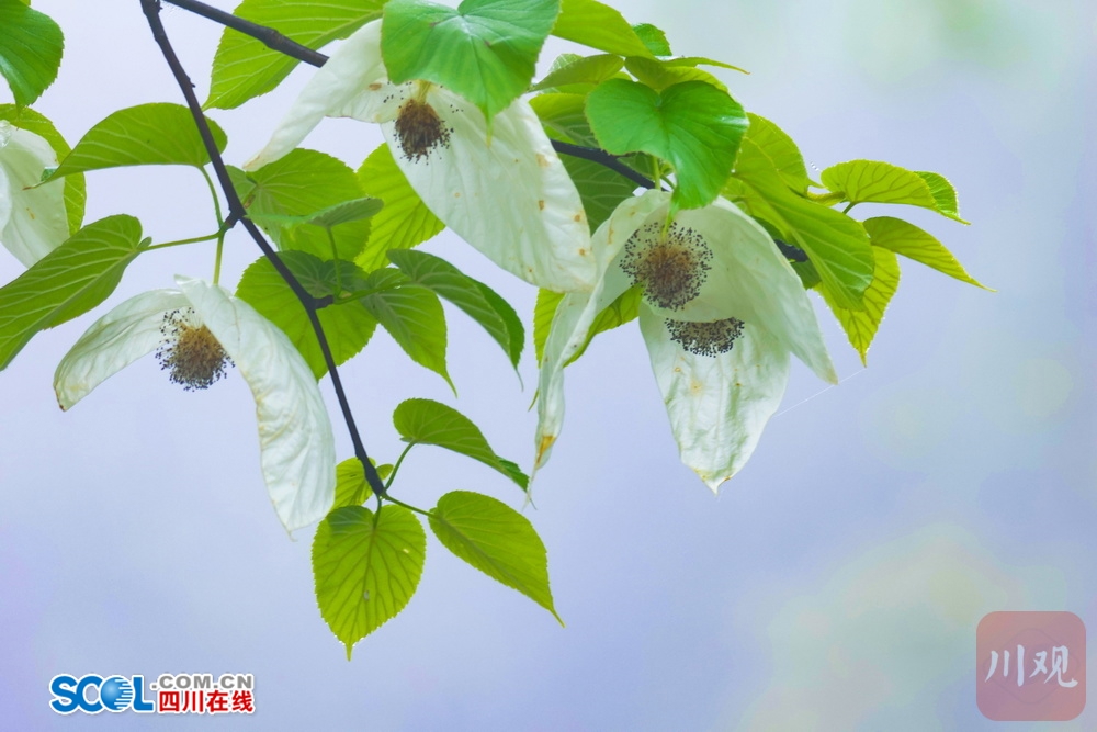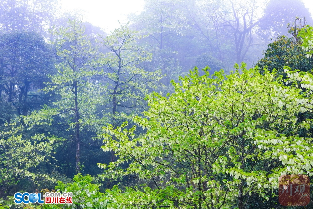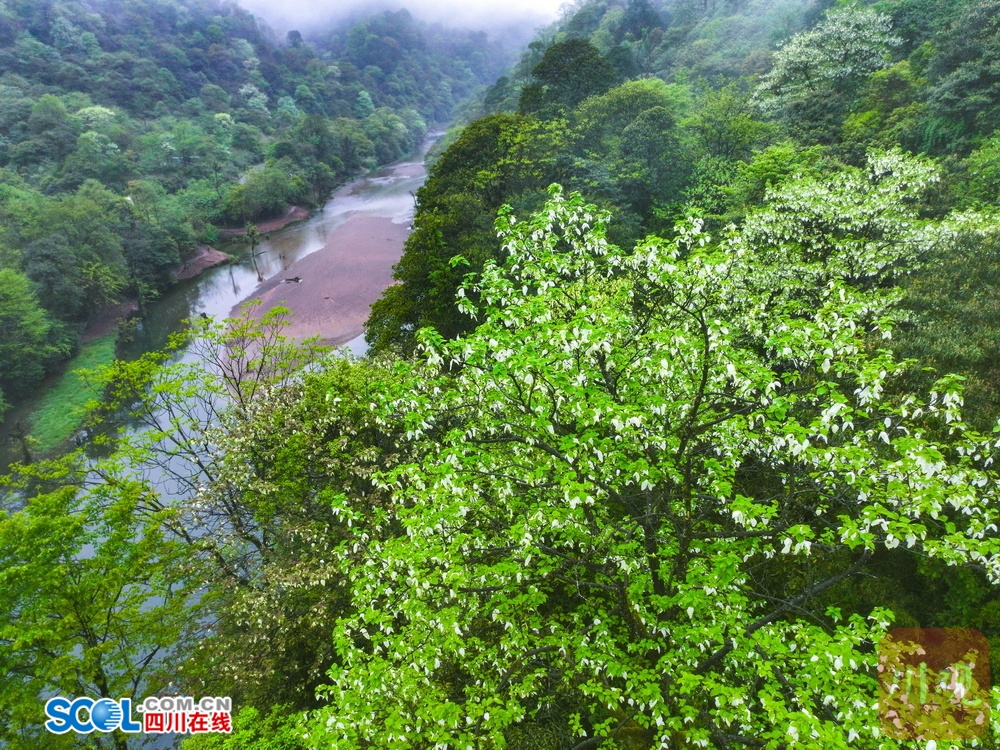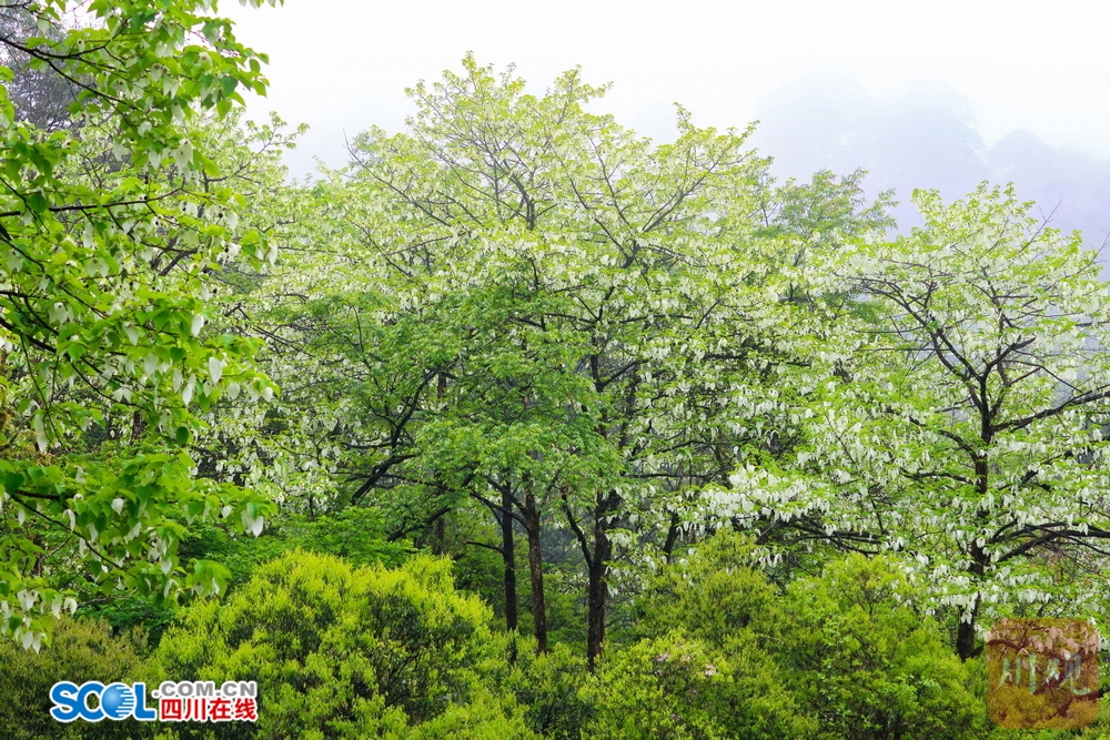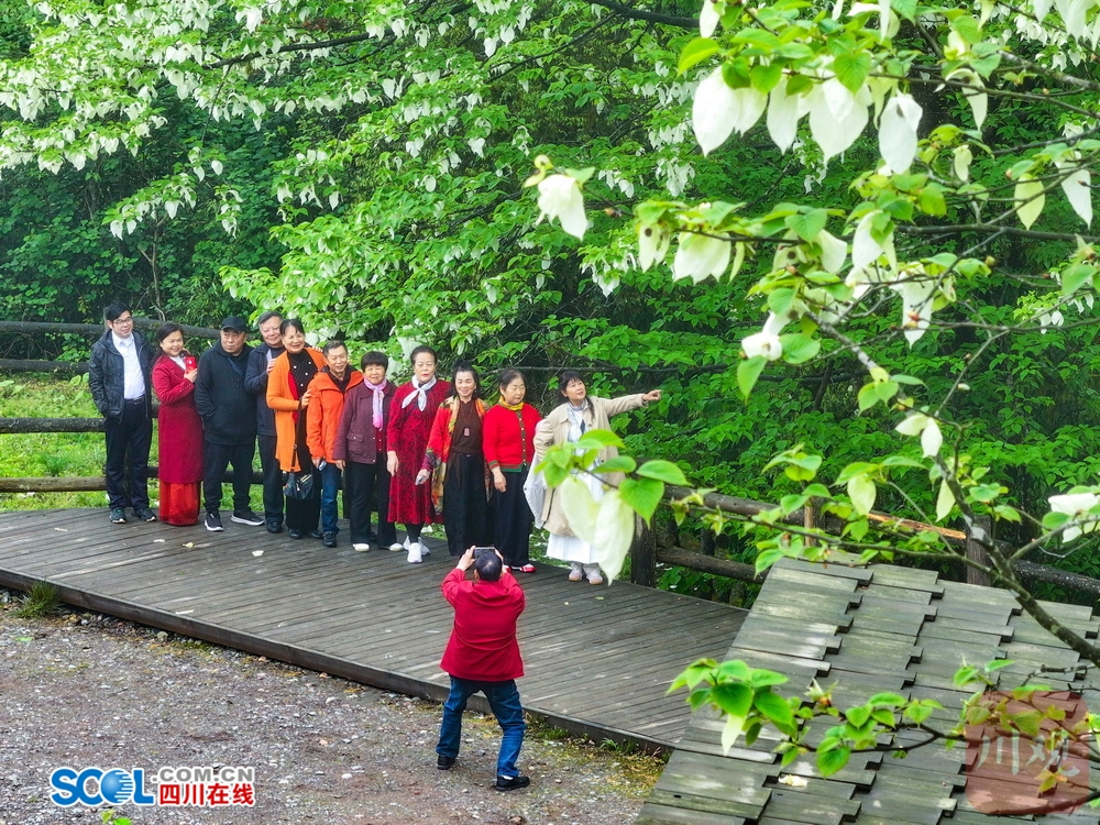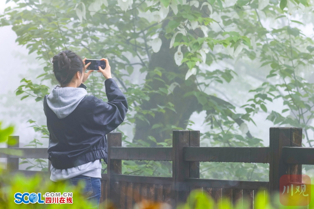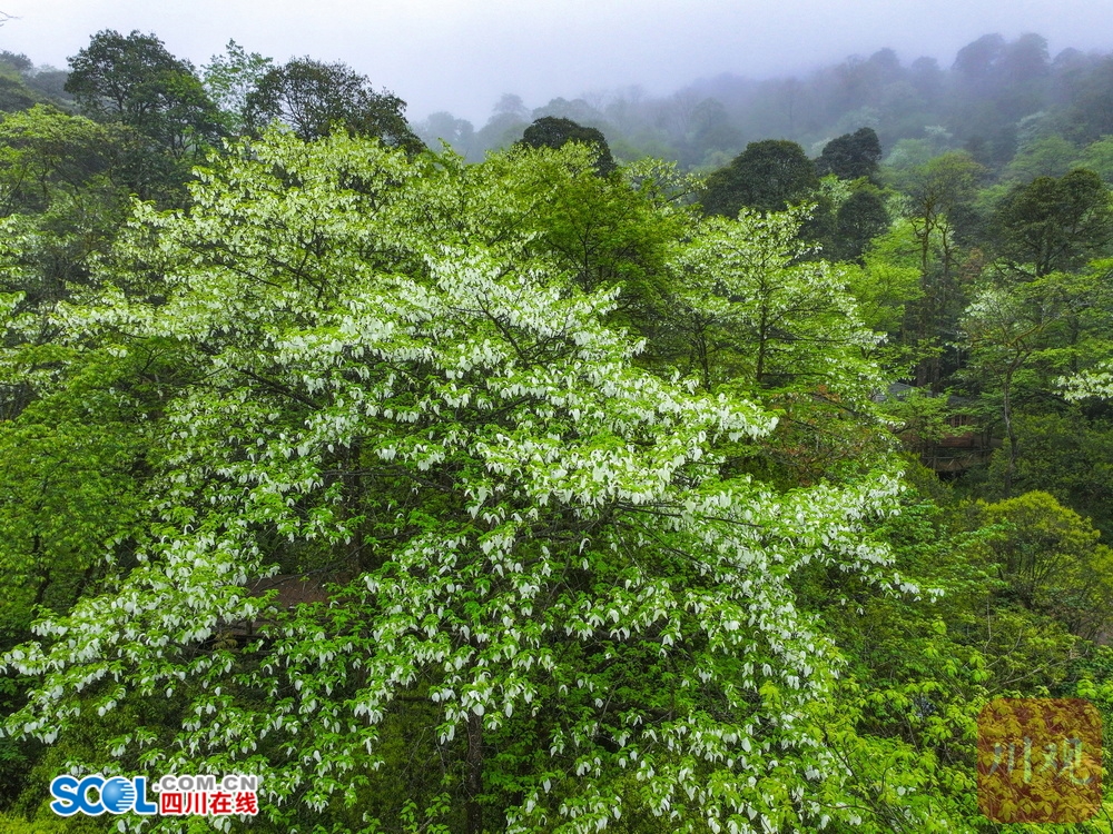 四川在线(雅安频道 黄刚 廖诗雪)4月21日,走进雅安市荥经县龙苍沟国家森林公园,山间薄雾笼罩,游客三三两两举着手机找角度。“这也太梦幻了吧!”“真像鸽子在飞!”惊叹声在林间此起彼伏。顺着游客的镜头看过去,两片白色苞片托着圆球状的花序,花瓣上挂着细小的水珠。山风拂过,满树白花随风轻舞。
